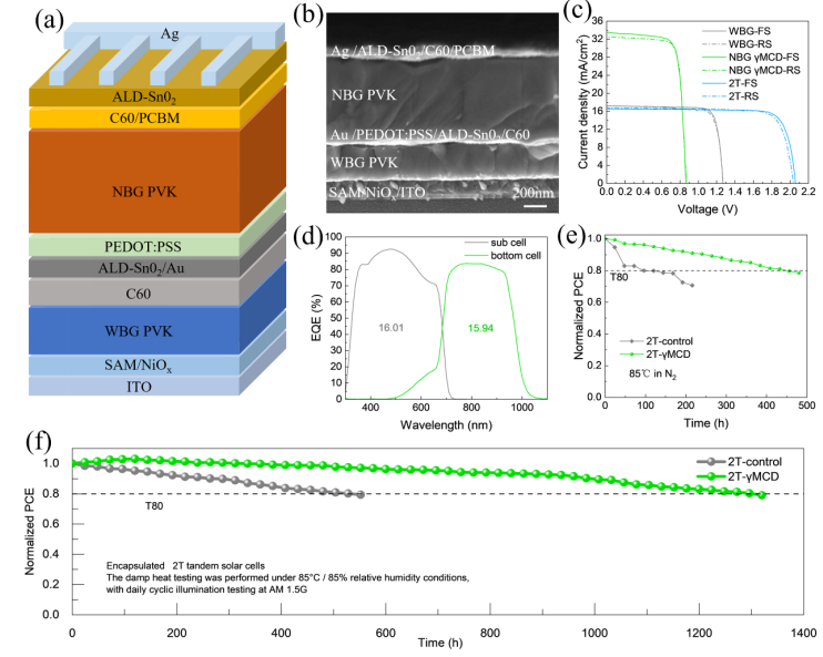 (图1 a) 全PVK串联太阳能电池(TSC) 结构示意图。b) 全PVK TSC的横截面扫描电子显微镜(SEM) 图像。c) 添加了𝛾MCD的全PVK TSC的J-V曲线。d) 添加了𝛾MCD的全PVK TSC的EQE曲线。 对照器件和𝛾MCD改性器件在e) 充满氮气的手套箱中的85°C的存储稳定性。封装的对照器件和封装的𝛾MCD改性器件在f) 在85%相对湿度和85°C条件下的存储稳定性。)