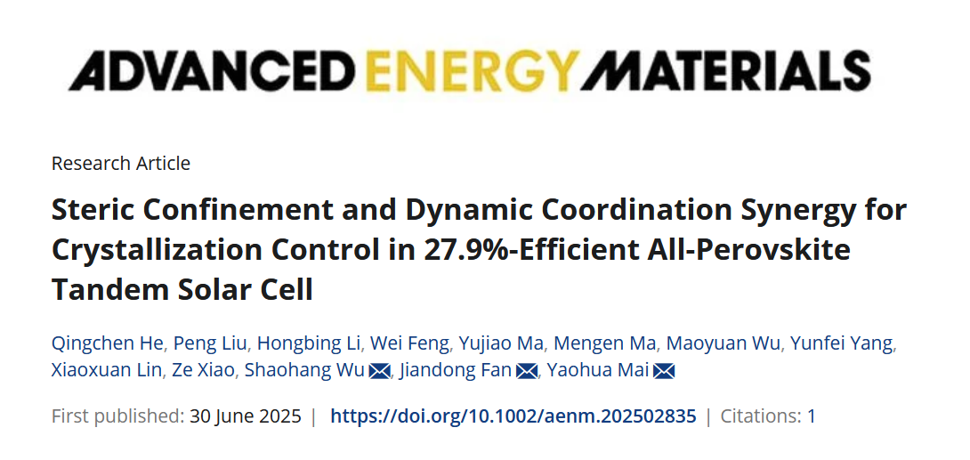 近日,物理与光电工程学院新能源技术研究院的麦耀华教授团队,联合广东脉络能源科技有限公司,在Adv. Energ. Mat. (《Advanced Energy Materials》(影响因子:26.8))期刊发表高效率全钙钛矿叠层电池成果,题为“Steric Confinement and Dynamic Coordination Synergy for Crystallization Control in 27.9%-Efficient All Perovskite Tandem Solar Cell”。